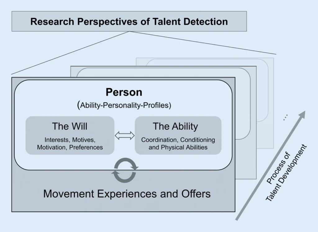 “The central element of the present proposal is the person (athlete) who has a certain ability–personality profile. This profile includes the two areas of the will and the ability. When creating suitable (movement) offers for a person, both the abilities and the will should be considered. At the same time, previous experiences of different offers in turn result in characteristics of the abilities and the will. Thus, it is not only important to consider the current individual ability–personality profiles of a person, but in the field of talent development it is equally important to gather experiences to form these profiles (interest, motivation, etc.). Thus, over the time of the talent development process, there are always changes in the ability–personality profile and thus changes in the Movement Experiences